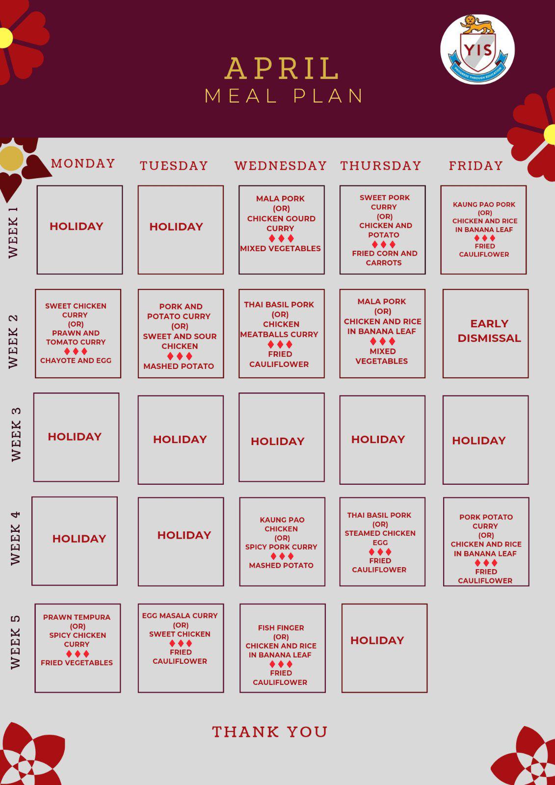 The YIS cafeteria is excited to introduce a monthly meal plan designed to provide students with a variety of nutritious and delicious meals.